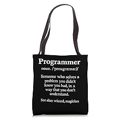 Funny definition design about programmers. Perfect for programmers, coders, and software developers who enjoy a humorous take on debugging, coding, and tech life. A fun way to show passion for technology and computer science. Great for anyone in the tech world, whether engineers, students, or IT professionals who appreciate clever designs that highlight coding humor and spark conversation. 16” x 16” bag with two 14” long and 1” wide black cotton webbing strap handles. Made of a lightweight, spun polyester canvas-like fabric. All seams and stress points are double-stitched for durability, and the reinforced bottom flattens to fit more items and hold larger objects. Spot clean/dry clean only.