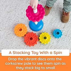 Two amazing Fat Brain early-learning toys in one fun bundle! Give your little one an innovative approach to stacking and shape learning SpinAgain is a stacking toy with a twist; Drop the vibrant discs onto the corkscrew pole to see them spin as they stack big to small InnyBin is a unique shape-exploration experience; Reach through the elastic bands to grab the six textured shape blocks Encourages fine motor skills, spatial reasoning, sensory learning, early learning, exploration, experimentation SpinAgain includes 6 discs, reversible wobble base, corkscrew pole, measures 16 inches tall; InnyBin includes sorting box, 6 unique shapes, measures 5.5 x 5.5 x 5.5 inches