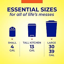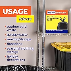 Package Includes: Forty (40) Hefty Essentials Drawstring 39 Gallon Trash Bags, Scent Free, Black Scent Free Trash Bags: These Hefty Essentials 39 Gal Trash Bags are unscented and are ideal for using in the yard, garage, or basement Easy Drawstring Closure: The easy-to-use drawstring closure makes lifting, tying, and carrying your XL trash bags hassle free, while securely locking in messes and odors Multiple Household Uses: Ideal for handling yard waste and other house projects, use these large drawstring trash bags to collect grass clippings, fall leaves, tackle home remodels, clean out basements, and more Essential Strength, Everyday Value : Hefty Essentials 39 Gallon Garbage Bags are a smart, budget-friendly choice for families who want to stock up and save on their garage trash bags