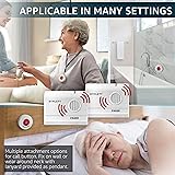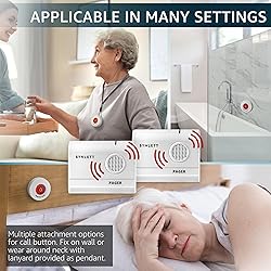 PORTABLE CAREGIVER PAGERS: This wireless system includes 1 SOS call button and 2 portable caregiver pagers, allowing caregivers to move freely while still receiving instant alerts from seniors, patients, or loved ones. EASY TO USE CALL BUTTON: A simple press on the SOS button sends a wireless signal to both pagers. Seniors and patients can request help quickly, making daily caregiving easier and stress-free. The life alert button can be worn around the neck with the included breakaway lanyard or mounted on a wall near the bedside, bathroom, or doorway using the provided bracket. FLEXIBLE AND VERSATILE: Caregiver pager comes with a belt clip that can be clipped on the belt or be placed on a flat surface. Switch to DINGDONG for a loud chime/doorbell alert in 3 Adjustable Volume Levels. Switch to ALARM for a continuous alarm siren when receiving signal from call button. Unlike other competitors, this pager save you time and energy from cycling thru dozens of tones to choose your alert tones. COMES WITH EVERYTHING YOU NEED: The call bell system works from small family care to medium carehome. Wireless signal range between the pager and beepers or panic button is up to 500 feet in open area. Effective and compact adult monitors for elderly and the seniors. All the needed accessories and batteries are included in the package and simply unbox with effortless setup and ready to use. ABSOLUTE PEACE OF MIND: SYNLETT simple alert call buttons and pagers system provided comprehensive and care service support. 12 MONTHS of product support with ultra-long lasting battery life on both pagers and nurse call buttons.