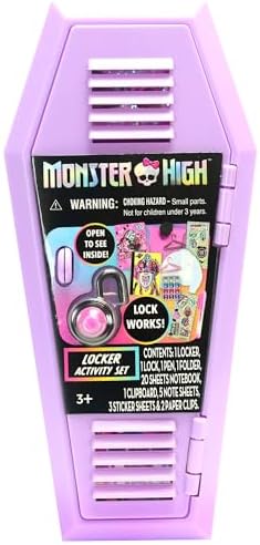 MONSTER HIGH: LOCKER ACTIVITY SET - Unleash your inner ghoul and get creative with the Monster High Locker Activity Set! Open the lavender, coffin-shaped locker to discover a spooky-chic collection of stationery supplies. The Monster High Locker Activity Set makes journaling, note-taking, and adding stickers to doodles loads of ghoulish fun! Write secret messages, make to-do lists, and decorate your pages with fang-tastic sticker embellishments for a touch of eerie flair. Kids will love organizing their mini supplies inside the locker’s working lock compartment and showing off their Monster High style. Durable, portable, and frightfully fun, this set makes a great gift for young fans and budding creatives ages 3 and up. Perfect for classroom play, travel fun, or imaginative journaling adventures, it’s the ultimate way to express spooky-cool style! With so many creepy-cute accessories to discover, every journaling session becomes a monster-inspired masterpiece. INCLUDES: 1 Locker, 1 Clipboard, 1 Gem Sticker Sheet, 1 Mini Notebook with 20 Sheets, 2 Hanger Paper Clips, 1 Mini Gel Pen, 1 Mini Lock, 1 Mini Folder, 2 Foil Sticker Sheets, and 5 Note Sheets.