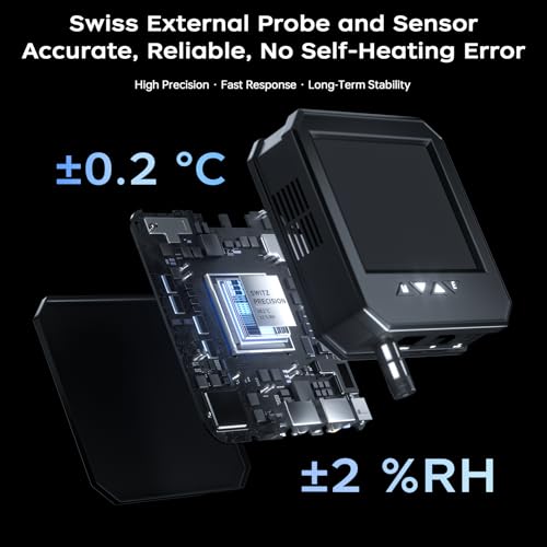 - Precision Monitoring for Critical Environments: The APEM-5930 is a professional temperature and humidity monitor built for continuous reliability in data centers, network closets, and industrial environments. Featuring a Swiss-grade external probe with ±0.2 °C and ±2 %RH typical accuracy, it delivers precise real-time measurements of temperature, humidity, and dew point — ensuring sensitive equipment stays within safe operating conditions.