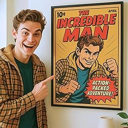 🎨 ONE-OF-A-KIND CUSTOM COMIC STYLE PORTRAIT- Turn your favorite photo into a unique retro comic-style poster! Whether it’s you, your partner, or your best friend, we transform your picture into an authentic comic cover with dramatic poses, colorful details, and personalized titles. Perfect as a personalized photo gift with custom text and design. 🖼 4 FRAME OPTIONS & 3 SIZES AVAILABLE- Choose from black, white, natural wood frame, or frameless. Sizes include 9.5×13”, 11.25×15.25”, and 13.25×19.25”. Each frame features durable acrylic glass to protect your vibrant photo print, making your personalized poster a stunning wall centerpiece. 💡 CUSTOMIZE WITH NAME & TEXT- Make it truly yours: add names, personalized comic-style captions or quotes directly onto your poster. Ideal as custom wall art, framed photo gift, or a unique poster you design yourself for birthdays, anniversaries, or special occasions. 🏠 RETRO VINTAGE DESIGN FOR HOME DECOR- Inspired by classic American comic books from the 60s to 80s, this personalized vintage style artwork adds nostalgic charm and personality to any room—living room, bedroom or office walls. 🎁 THE PERFECT PERSONALIZED GIFT- A creative and thoughtful present for birthdays, Valentine’s Day, Mother’s Day, Father’s Day, Christmas or anniversaries. Surprise your girlfriend, boyfriend, spouse, or any comic-loving friend with a gift they will treasure forever.
