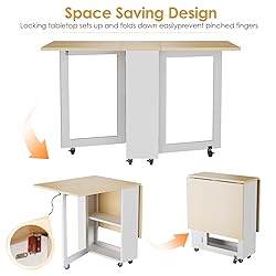 - Transform your small living space with this ingeniously designed LotFun folding dining table. Perfect for apartments and compact kitchens, this versatile piece combines style with functionality. The oak and white finish creates a modern aesthetic while offering practical storage solutions. When fully extended, this table comfortably seats 4-6 people and supports up to 200 pounds. The table features two-tier storage cabinets and convenient drawers, ideal for organizing kitchenware and daily essentials. Premium 360-degree swivel casters with brakes ensure easy mobility and stable positioning. When not in use, the table folds completely flat, making it perfect for tucking away in corners or beside sofas. The single-layer tabletop can double as a desk, while the mobile design allows it to serve as a kitchen island. Assembly is straightforward with detailed instructions and labeled components. This multi-functional piece efficiently maximizes space while keeping your living area organized and clutter-free, making it an essential addition to any compact home.