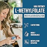 HIGH-POTENCY: Provides a high-potency serving of 15mg L-Methylfolate in the 5-MTHF calcium salt form. This bioactive form of folate is readily utilized by the body. VITAL METHYL B12 COFACTOR: Methylcobalamin B12 and Methylfolate have co-dependent relationships that work together in the body's methylation processes. Methylfolate cannot complete the methylation process and breakdown of homocysteine without Methyl B12. ACTIVE FORM OF FOLATE: Methylfolate is the most metabolically active and bloodstream-ready form of Folate or Folic Acid (vitamin B9). It is immediately absorbed into the bloodstream because it does not require processing or breakdown by the body. This is vital for those with methylation issues that cannot properly process folic acid. SUPPORTS BRAIN, MOOD & ENERGY HEALTH: Important for healthy neurotransmitter function linked to focus, energy, and a balanced mood. SUPPORTS CARDIOVASCULAR, NITRIC OXIDE & NERVE HEALTH: Helps maintain healthy homocysteine levels, promotes normal heart function, and supports nitric oxide production for overall circulatory and nerve well-being.