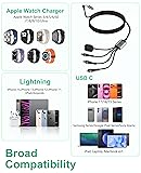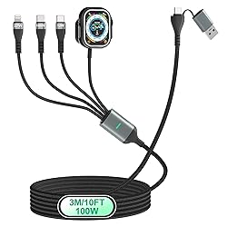 【4-in-2 USB C Multi-Charging Cable Apple Watch Charger】 One cable is equipped with four outputs, including 100W USB-C (laptop/tablet), 12W USB-C (mobile phone/headphones), Lightning (iPhone) and magnetic Apple Watch charger, which can power all your important devices at the same time. USB-A/USB-C input makes it universally compatible with adapters or power banks for travel, office or home. 【Wide Compatibility】Whether it is an Apple family device (Lightning + Magnetic Watch), an Android/Windows device (dual USB-C port), or even mixed use, this cable is perfectly compatible. The built-in magnetic Apple Watch charger is compatible with all Series 1-10, SE, and Ultra/Ultra 2 models. 【100W USB C Fast Charging]】This 100w multi charging cable provides fast and stable charging. The 100W USB-C port is specialized in high-performance devices such as laptops, MacBook Pro and iPad Pro, while the 12W USB-C port is intelligently adapted to mobile phones, headphones, etc., providing stable and fast charging. A two-pronged approach doubles charging efficiency and halve waiting time. 【Convenient Dual USB-C Design】The dual USB-C configuration on this multi-charging cable allows charging devices at the same time. 100W USB-C also supports 480Mbps data transfer for laptop/phone/iPad and car use, a true smart cable system for a connected lifestyle. 【Extra Long 10FT Cable - Durable and Efficient】 This 10ft multi-charging cable is designed for flexibility and strength, allowing you to enjoy freedom of movement. We use thickened wire core, high-strength braided outer cover and alloy-reinforced interface to ensure that multiple devices can be charged at the same time with absolute peace of mind. The ultra-long reach allows the device to be used on the bed, sofa or in the car.