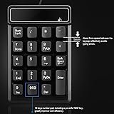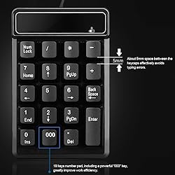 Plug and Play: USB wired connection via USB port, no drivers needed, plug and play. User-friendly: Full-size 19 keys number pad, including a powerful "000" key, greatly improve work efficiency. Comfotable: Integrated ergonomic tilt reduces strain, great for those working on spreadsheets, accounting files or financial applications. Mechanical Feel: Suspended keycaps provides mechanical feel keystroke. Curved surfaces fits the shape of your finger and ensures comfortable typing. Crater design keycaps are higher than the bottom board, no need to worry about splashing water by accident.