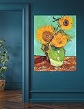 Van Gogh's Three Sunflowers in a Vase radiates joy and tenderness-golden blooms basking in light against a turquoise sky, celebrating warmth, gratitude, and the enduring vitality of nature's beauty. Archival Giclee Excellence: Printed with genuine Epson UltraChrome PRO pigment inks on premium cotton-poly blend canvas. The cotton texture absorbs pigment deeply for natural tone transitions, while polyester fibers ensure strength and stability. Acid-free and museum-grade, it preserves color brilliance for over 100 years. Gallery Wrapped & Ready to Hang: Stretched on a 1.5 inch deep gallery frame, this 30x40" vertical canvas features neatly finished edges and ready-to-hang hardware. A statement piece for stairways or tall accent walls-bringing elegant height, luminous color, and refined presence. Bathed in emotion and light, this Van Gogh canvas fills the room with glowing energy. The sunflowers' warmth and vivid texture create a tranquil atmosphere that celebrates beauty, optimism, and refined living IPIC Fine Art Reproduction: Combining advanced giclee technology with artisanal framing, each piece reflects our commitment to enduring craftsmanship and timeless style-bringing art, light, and meaning into everyday life.