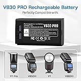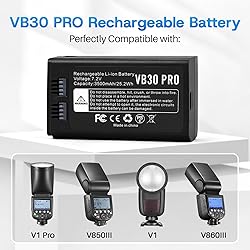 - Specifications:Battery Voltage:7.2VBattery Capacity: 3500mAhCondition: 100% New from ManufacturerBattery Type:Li-ion Compatible Part Numbers:VB30,VB26,VB26A,VB26B Compatible Models (Use "Ctrl+F” to find your model quickly)Compatible with Godox V1 flash seriesGodox V1S V1C V1N V1O V1FCompatible with Godox V1 PRO flash series Godox V1Pro-C V1Pro-N V1Pro-S V1Pro-O V1Pro-FCompatible with Godox V100 flash series Godox V100-C V100-N V100-S V100-O V100-FCompatible with Godox V860III flash series Godox V860III-C V860III-N V860III-S V860III-O V860III-FCompatible with Godox AD100PRO flash series Compatible with Godox V850III flash series Package Include: 1 x VB30 Battery Safety Instructions:We recommend that you search for battery removal tutorials on the Internet in advance, or seek help from a professional technician. We won't responsible for any damage due to improper operation.Please handle the battery pack steadily, do not bend the battery pack, otherwise it may short circuit.Duing charing, the temperature of the bttery pack will rise slightly. This is nomal and not a malfunction.Stop charging the battery immediaely if charging does not complete in reasonable time.Dispose the battery pack and its accessories in stict accordance with local laws and regulations. Do not dispose this product together with household waste.If unpleasant smell is detected and deforming casing occurred during charging, turn off the power supply immediately, and unplug the power cord from AC wall-socket to avoid possible damage or risk (e.g. fire). Upgraded VB30 PRO 3500mAh Round Head Camera Flash Battery Universal Replacement for GODOX V1, V1PRO, AD100 PRO, V860III, V850III flash units, direct replacement for VB26. Solves short runtime & aging battery High Capacity 3500mAh delivers long-lasting power for all-day photoshoots/videography. Seamless tool-free installation, stable output, revives your flash’s peak performance. Ideal for professional photographers – reliable, exact fit, no compatibility issues. Key High Capacity, Long-Lasting, Flash Battery Replacement, Godox Compatible.