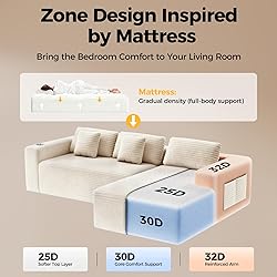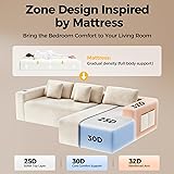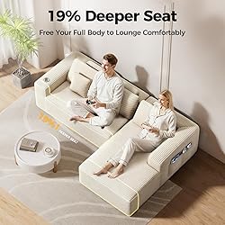[Extra 19% Deeper Seat]: Designed for full-body stretch, this sectional couch features an 33.5in deep seat which 19% deeper than standard sofas—allowing you to stretch out and unwind in total comfort. Perfect for tall users or anyone who loves extra room, the oversized design (68.5" D x 108" W x 23.6" H) transforms your living room, bedroom, or reading nook into a personal relaxation haven.This minimalist L shaped couch maximizes space when placed against a wall. [No Assembly Required] : Our modular cloud lounge escape the typical furniture setup hassle. Simply unbox all parts and lightly tap each segment to boost its springiness and poof, bringing it back to its photogenic glory. . Enjoy fast, convenient delivery, and start relaxing on your new sofa as soon as it arrives! And it suggets allow 48–72 hours to regain original shape and firmness. [Perfect Balance of Softness & Support]: Engineered like premium mattresses, our multi-density foam delivers zoned comfort: ultra-soft 25D seat surface, supportive 30D backrest and seat bottom, and firm 32D armrests. Unlike spring sofas, our all-foam design eliminates noise, bulging and puncture risks while providing superior pressure relief and lasting support. Bring the bedroom comfort to your living room. [4 Storage Pockets & 1 Removable Catch All Tray]:The main seat's armrest features a versatile removable tray or storing small items like earrings and car keys. When the multi-function tray is removed, the interior sofa cover doubles as a cup holder for drinks.Plus, enjoy four built-in fabric pockets (two on each side) designed to hold books, magazines, or tablets - keeping your living space neat and everything within easy reach. [3 Removable & Versatile Headrest Pillows]: Our sofa bed comes with three detachable headrest pillows, designed to provide better neck and back support for enhanced comfort. Features seamless velcro which will not affect the appearance after removal. They double as soft, cozy pillows, perfect for napping, travel, or simply cuddling for extra comfort. Whether you need lumbar support, a nap pillow, or a snug companion, these versatile pillows adapt to your needs. [Please Note]: Due to lighting and monitor settings, slight color variations may occur. To ensure safe shipping, your sofa is expertly compressed. Upon arrival, it may feel softer than expected. This is normal! Simply allow 48-72h for the high-resilience foam to decompress completely and reveal its ultimate comfort and shape.