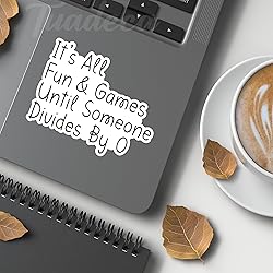 - Add a touch of mathematical humor to your belongings with this set of 3 vinyl decals featuring the witty phrase 'It's All Fun & Games Until Someone Divides By 0'. Each decal measures 3x2.2 inches and is perfect for decorating laptops, water bottles, books, tumblers, and phones. The matte finish vinyl stickers are water-resistant and removable, making them ideal for indoor use on smooth surfaces. These modern, decorative decals showcase your love for math and engineering with a humorous twist. The multicolored design adds personality to your items while maintaining a clean, professional look. The irregular-shaped stickers are easy to apply and remove, leaving no residue behind. Perfect for book lovers, math enthusiasts, and engineers who appreciate clever mathematical humor. These durable vinyl decals by Tuadeca are designed to make a statement while keeping your belongings uniquely personalized.