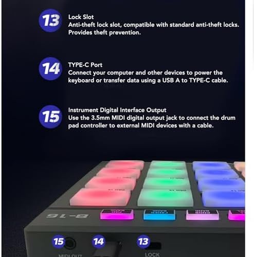 - Portable Design: MIDI drum pad controller boasts a lightweight design for on the go music production. With 16 vibrant, color illuminated drum pads, you can produce music anytime and anywhere. Record up to 48 custom sounds for creativity.