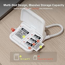 【2-in-1 Storage & High-Speed Transfer】Combines ultra-fast data reading with organized card storage in one compact device. Store 2 SD + 4 Micro SD cards while transferring data at speeds up to 312MB/s 【Dual-Card Simultaneous Transfer & Wide Compatibility】Read both SD and Micro SD cards at the same time. Supports UHS-I/UHS-II cards and works with cameras, drones, action cams, Windows, macOS, Linux, Android, and iPadOS 【Portable & Tangle-Free Lanyard Cable】Palm-sized and lightweight (only 50g), it fits easily in your pocket or bag. The built-in braided cable doubles as a carry strap and detaches easily with a push-to-unlock snap 【Plug-and-Play & OTG Ready】Features a standard Type-C interface with hot-swap support. Connect directly to OTG-enabled phones/tablets for instant file sharing—no adapter needed for mobile devices 【Card Status Markers & Secure Lock Design】Clearly identify used/unused cards at a glance. The innovative snap-lock mechanism keeps the cable securely attached until you release it, preventing loss