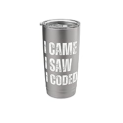 This design is perfect for those who conquer the world of programming. Featuring the quote "I Came, I Saw, I Coded", a bold declaration of coding prowess. Ideal for programmers, tech enthusiasts, or anyone who takes pride in their coding skills. Great for those who love to express their passion for coding at a tech event, or simply to show off your love for programming. Dual wall insulated: keeps beverages hot or cold Stainless Steel, BPA Free Leak proof lid with clear slider