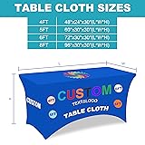 - Our personalized tablecloth combines functionality and style, designed to elevate any event with a tailored fit. Choose from multiple size options to suit your needs: 4ft (98"x75"), 5ft (108"x77"), 6ft (114"x79"), and 8ft (137"x79"). Whether you’re setting up a small display booth, hosting a large-scale tradeshow, or decorating for a wedding, birthday, or anniversary, we’ve got the ideal size to ensure a seamless, wrinkle-free fit. Its versatility shines across settings—compatible with folding buffet tables, outdoor picnic tables, restaurant dining tables, and kitchen surfaces—making it a clutter-free solution for both commercial and personal use. Crafted from 100% premium polyester, this tablecloth is built to last. The durable fabric resists tears, wear, and damage, maintaining its vibrant color and smooth texture even with repeated use. It’s naturally wrinkle-resistant, ensuring a neat, professional appearance that stays polished throughout your event. Cleaning is effortless: simply machine wash in cold water with mild detergent, and it dries quickly without shrinking—easy to store and ready for your next occasion. Designed for convenience, it features elastic corner straps that make installation a breeze, securing the tablecloth tightly to prevent slipping or shifting. The edges are finely hemmed with meticulous stitching, adding an elegant finish that enhances any decor. Whether you’re branding your business with a custom logo or adding a personal touch to a celebration, this tablecloth blends practicality with sophistication, making it a must-have for events of all sizes.