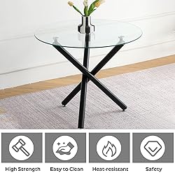 5-Piece Round Dining Table Set: This 36-inch round dining table set with 1 high-quality round dining table and 4 comfortable boucle chairs. Ideal for a family or guests gathering. The spacious round design promotes conversation distance, creates a welcoming, cozy atmosphere, suitable for both casual family meals and intimate social gatherings. Upgraded Upholstered Chairs: This set of four kitchen chairs features plush fabric-upholstered boucle seats that deliver both comfort and sophistication, enhancing any modern dining space with a warm and inviting atmosphere. Designed with ergonomic support, these cushioned chairs provide superior comfort compared to traditional benches, which often feel cramped and less accommodating. High Quality Round Dining Table: This round dining table set is made with galss, which is waterproof and scratch-resistant. This dining room table set can be easily cleaned with a sponge and water. The sturdy steel frame and sturdy metal base provide strong support and stability. Space-Saving Kitchen Table Chairs Set: Round dining table design can often seat more people in a smaller area compared to rectangular tables. The absence of corners creates a more open space around the table, allowing for easier movement through the room and better accessibility to reach dishes. The chair can be gently pushed into the area under the dining table, giving you more room to move around Easy Assembly & Warmful Service: This round glass dining table set comes with all accessories and detailed instructions, which are divided into step-by-step tutorials. Just to follow it and complete the installation easily. If you have any questions, please contact us, we will solve the problem for you in 24 Hours.
