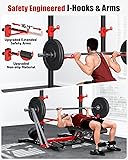 【Fixed 83” Frame for Maximum Stability】YOLEO squat rack features a sturdy 83” fixed frame, ensuring a solid foundation for safe and effective home gym strength training 【Adjustable Pull-Up Bar for Custom Workouts】The pull-up bar height adjusts from 71.5” to 80.5”, making this squat rack with pull-up bar ideal for different user heights and training needs 【Upgraded Safety Arms & J-Hooks for Secure Lifting】16.5” safety arms offer extra support for squats and bench presses, while 4” J-hooks ensure safe and easy barbell rack reracking, making solo training more secure 【Adjustable Width for Versatile Strength Training】This squat stand allows you to adjust the width from 35” to 67”, making it perfect for bench presses, squats, and other strength exercises at home 【Heavy-Duty Power Rack with Reinforced Stability】Built with a wide 54.7” x 43.7” base, 6 reinforced metal plates, and a triangular structure, this power rack provides maximum stability for intense workouts. 【Multi-Functional Squat Stand with Pull-Up & Dip Bars】 Includes a pull-up bar and dip handles, enabling a full-body workout with pull-ups, dips, push-ups, and squats in one squat rack for home gym setup 【Supports Up to 1000 lbs for Serious Strength Training】This squat machine for home gym can hold up to 1000 lbs, offering a stable and durable barbell rack for powerlifting and bodybuilding 【Space-Saving Squat Rack with Plate Storage】 Keep your home gym organized with built-in storage for 1” & 2” weight plates, reducing clutter in your workout area 【Fits 6FT & 7FT Barbells for Maximum Flexibility】 This squat rack for home gym accommodates both 6FT and 7FT barbells, making it ideal for various strength training routines