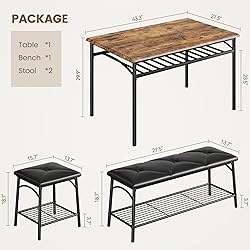 【Industrial Modern Style】 This 4-piece dining table set combines metal and wood to present straight lines and clean silhouettes for a clean, modern design. Seats 4 people comfortably, perfect for dining room, kitchen, living room 【Premium Craftsmanship】 Crafted from sturdy metal and thick board, our 4-person dining table set with bench exudes excellence. The smooth, easy-to-clean surface is resistant to rustic wear, and the ergonomically designed chairs offer an unparalleled sitting experience. 【Space-Saving Design】 Effortlessly optimize small spaces – chairs and bench neatly tuck under the dining table when not in use. Keep your home, kitchen, living room, and dining room impeccably organized with this 4-piece dining set with bench. 【Ample Storage Space】 Compared to traditional wooden chairs,our dining set for 4 has designed storage rack for both table and bench to enlarge your home spaces. Our chairs are all equipped with thick cushions to make you sit more comfortably 【Easy to Assemble and Maintain】 Comes with clear instructions and necessary accessories, just follow the instructions for easy installation. The small kitchen table surface is smooth and easy to clean, just simply wipe it down