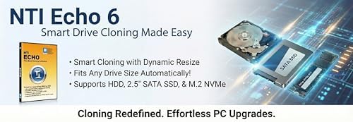 NTI Echo 6 is the perfect solution for all your cloning needs. It is a smart cloning software that allows you to make an exact copy of your PC's HDD to another HDD or SSD. NTI's design makes this once tedious upgrade task a breeze for all users. (Video Tutorial: https://youtu.be/7Etsi9lTYyo )Features - Dynamic Resize Cloning: With a single click of the mouse Echo will clone your entire hard drive (i.e. Operating System, Programs, Data, Partitions, etc.) to another drive. Dynamic Resize cloning method uses Echo’ smart cloning technology and will automatically resize the original drive’s partitions to fit onto a smaller or larger replacement drive. This is the default and recommended cloning method. Filtered Cloning: Allows users to exclude certain files from the cloning process. Echo will make a clone of your drive and at the same time exclude the files you have selected from being part of the newly cloned drive. An ideal solution for when the target drive is too small for all of the source drive’s data.Partition Cloning: Allows for partition only cloning for users that need more flexibility. Perfect for cloning just the Operating System partition on a user’s computer hard drive to a new smaller solid state drive.1-to-1 Cloning: Retains the original hard drive’s partition structure and size when cloning to a replacement drive. With this cloning method if the new drive is larger than the original drive the unused space on the new drive will be left unallocated for future use.User-Defined Cloning: Enables the user to adjust the size of the partitions on the new drive. This cloning method allows the user to customize the replacement drive by increasing or decreasing the partition sizes to fit their free space requirements.NOTE: (1) Available via Download. (2) Not intended to work with Dynamic Disks.