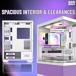 - Make your build stand out with the RAIDMAX i802 VIBE, a compact yet powerful ATX mid tower gaming case with bold color, full visibility, and serious airflow. Designed with a panoramic tempered glass side panel, this case lets you show off your components and lighting from edge to edge. The i802 VIBE comes pre-installed with 5x fixed RGB fans, delivering vibrant lighting and efficient airflow without the need for controllers or software. Despite its compact footprint, it supports high-end GPUs up to 400mm, 240mm front-mounted liquid coolers, and standard ATX motherboards — making it the perfect blend of size, style, and performance.