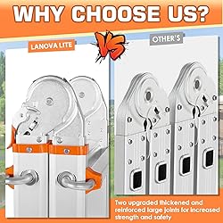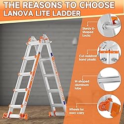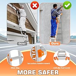 Premium Materials:Crafted from top-grade industrial aluminum alloy, this ladder features 2mm thick tubing—double the thickness of many competitors. With added anti-oxidation treatment, it’s built to stay strong and last longer. Unshakable Safety:Equipped with W-shaped anti-slip steps and reinforced thickened connectors, plus two anti-slip balance bars and 8 supporting points, this ladder delivers unshakable stability and security in every use. Lightweight Design:Extends up to 20 feet while weighing only 38 lbs. Features high-strength plastic components, smooth-rounded metal edges for safety, and built-in rollers for easy transport and storage. All-in-One Versatility:Easily transforms into a step ladder, A-frame, extension ladder, 90° ladder, or even scaffolding—ideal for a wide range of indoor and outdoor tasks, boosting productivity across the board. Friendly Reminder:Please read the safety instructions on both sides of the ladder before use to ensure safe and correct operation.