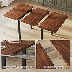 Package Note: The table and chairs will be delivered in 2 packages, they may not arrive at the same time, so please wait patiently Dining Table Set for 4: This dining table set includes 1 table and 4 chairs. Table size: 31.5"W x 31.5"D x 30"H inches(contracted); 47.2"W x 31.5"D x 30"H (expansion); This kitchen table can comfortably accommodate 2-4 guests, making it perfect for family gatherings or large gatherings Space-Saving for Extendable Dining Table: Equipped with the tracks this dining table for 4 can be quickly expand to a maximum of 47.2" of dining space with just one person when you need extra space, and can be tightly contracted when not in use. The dining chair can be moved under the kitchen table, making full use of space Thickened Durable Structure: This kitchen table set is made of high-quality medium density fiberboard, which is waterproof, scratch resistant. The strong load-bearing capacity provided by the sturdy metal structure ensures the stability of the kitchen table chairs set of 4 Safe & Comfortable Design: This dining room table features a corner guard design to protect your family from severe collisions, and the design of the backrest in the middle of the seat conforms to ergonomics, providing you with a comfortable backrest experience Functional & Easy Assembly: You can use the dining table set as a supplement to the terrace dining table, computer desk, desk, office desk, and breakfast corner. The 5 piece dining table setwith chairs come with detailed installation manuals and orderly packaging, easy to install