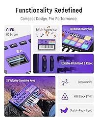 ✔️[Wireless & Portable, Create Without Limits]: This midi keyboard 25 keys supports wireless MIDI connection for fast and stable pairing with computers, tablets, or phones to transmit MIDI data seamlessly. The built-in 3000mAh rechargeable battery offers up to 5 hours of playtime on a single 3-hour charge. Weighing only 2.75 lbs and just 1.98 inches thick, this compact midi controller keyboard is perfect for on-the-go creativity ✔️[Bold Look, Built to Last]: The wireless connection midi keyboard featuring a high-quality matte spray-painted finish, made from high-strength PC+ABS housing that resists drops and pressure better than standard ABS. The premium UV coating on the shell and keys provides a smooth, scratch-resistant, anti-yellowing finish that keeps the midi keyboard controller's shine over time. Built to withstand rigorous use in both studio and stage environments ✔️ [Beginner-Friendly]: This wireless 25-key midi keyboard supports smart scales and smart chord generation with both Fixed Do and Tonic modes. In Tonic mode, simply play the white keys to perform eight scales, including major, minor, Dorian, etc, making it easy for beginners to start creating music right away. The midi keyboard with pads includes PC software that provides 120 instrument sounds and 8 drum kits, allowing you to play and hear music directly. Ready to use straight out of the box ✔️ [Visual Editing & Easy Parameter Control]: Equipped with a high-resolution OLED display with battery indicator and a 360° push encoder, this mini midi keyboard 25 keys lets you quickly adjust functions and parameters (Note, CC, PC, Channel, etc.) directly on the device. Simply press and rotate the main knob to assign settings for pads, knobs, function buttons, and Pitch & Mod wheels—no software required ✔️ [Flexible Control & Efficient Integration]: This 25-key USB MIDI controller features a built-in arpeggiator, pitch bend & modulation wheels, octave/semitone transpose, and sustain button for expressive play. Supports MIDI Clock Sync and GATE note length adjustment. 9 assignable endless knobs (2 banks = 18 controllers) send CC/PC messages. 3 transport buttons (Play, Stop, Record) support CC mapping, automatic MMC setup, and one-touch MMC mode switching
