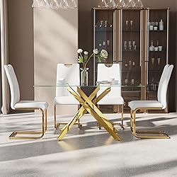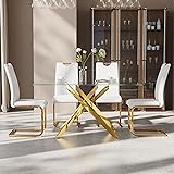 KATBOC 5-Piece Dining Table Set for 4, Modern Rectangular Glass Table with 4 Upholstered Leather Chairs, Space-Saving Dining Room Furniture Table & Chair Sets for Small Spaces & Apartment(White&Gold)
