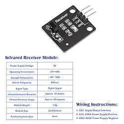 - Product Name: 38kHz Ir Receiver Ir Transmitter Sensor Module KitColor: BlackMaterial: PCB + Aluminum AlloyProduct Dimensions: 5.91*3.94*1.02 inchesPackage Contents: 4 Pcs Digital 38kHz Ir Receiver Sensor Module + 4 Pcs 38kHz Ir Transmitter Sensor Module Kit