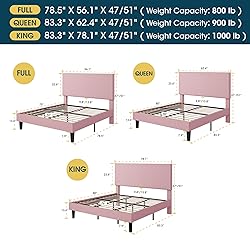 Adjustable Headboard: This upholstered bed frame comes with a headboard that can be adjusted between 47 and 51 inches, making it compatible with mattresses that are between 8 and 14 inches thick Soft Corduroy Finish: Wrapped in plush, high-density corduroy fabric, this bed frame combines durability with a sophisticated texture, adding a cozy and welcoming element to your room Sturdy Wood Construction: Constructed from robust wood, this bed frame features a solid wood structure, reinforced support legs, twelve durable wooden slats, and dense foam padding along the edges to ensure lasting comfort and stability. With a weight capacity of up to 800 lbs, it offers a reliable foundation for your mattress No Box Spring Needed: This bed frame features sturdy wooden slats that provide excellent support for your mattress, eliminating the need for a box spring. Simply place your mattress directly on the slats for a strong and stable foundation Simple Setup: This bed frame comes with all necessary hardware and detailed, easy-to-follow instructions, ensuring a quick and hassle-free assembly