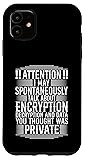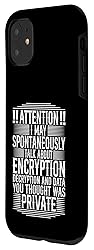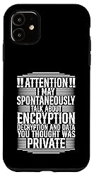 Embrace your inner IT Analyst with this cool design that celebrates the hacking culture. Perfect for tech meet-ups, cybersecurity events ATTENTION: I May Spontaneously Talk About Encryption, Decryption and Data You Thought Was “Private” Show your passion for cybersecurity and programming with this unique design, perfect for tech enthusiasts and professionals alike. Ideal for conferences, coding boot camps, or casual outings, this design helps you express your love for cyber security Two-part protective case made from a premium scratch-resistant polycarbonate shell and shock absorbent TPU liner protects against drops Printed in the USA Easy installation