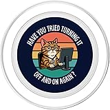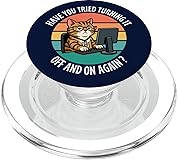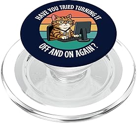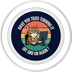 Hilarious Tech Support Design. Features a funny cat at a computer with the classic IT support phrase, perfect for anyone in tech, programming, or troubleshooting. Retro Sunset background with text “Have You Tried Turning It Off and On Again?” Perfect for Tech Lovers. Great for IT professionals, software developers, system admins, gamers, coders, and anyone who hears this question every day. Magnetically snaps on and off your phone case so you can easily swap between MagSafe compatible accessories. Adaptor ring included. Make any phone case MagSafe compatible by attaching the adaptor ring. A phone case is required but not included to use the wallet. Printed top is swappable. Close and twist to swap the top with a new design with other compatible PopGrip models.