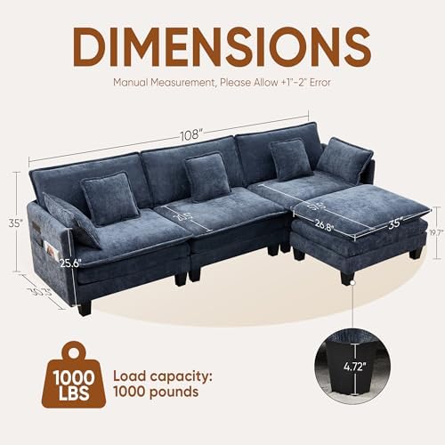 108" L Shaped Modular Sectional Cloud Couch with Ottoman, 3 Seats Modern Sofas with Charger, USB & Type-c Port with Deep Seat for Living Room, Bedroom and Apartment, Blue