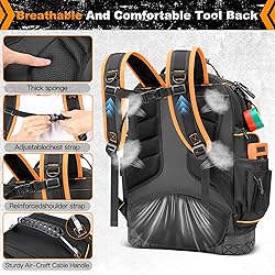 [Large Capacity]: Sroteck tool backpack features 14.6"L x 7.8 " W x 19.7"H, 3 large compartments, 47 internal pockets, large storage space, can store many large tools (pliers, hammers, wrenches, etc.) without squeezing, especially ideal gifts for handymen. [Full Opening]: The tool bag backpack is a full-opening design, that accesses easily. [Premium Material & Durable Bottom]: The backpack tool bag is made of high-density 1680D ballistic weave, which is abrasion-resistant and splash-proof. The bottom is hard molded to protect tools and enhance stability. [Sturdy Aircraft Cable Handle]: The handle is backed with aircraft cable to increase load-bearing capacity, and the soft silicone protective shell can reduce hand wear. HI-VIS DESIGN – Get clear visibility of tools with orange hi-vis internal fabric. [Special Design]: The included combination lock can ensure the safety of important tools; the USB interface improves work convenience! The dual-purpose zipper pocket on the side can be used to carry water bottles or tools according to personal needs. The reflective strips improve visibility in low-light conditions. WIDE APPLICATION: The tool bag organizer features full openings, multiple pockets, and high-density materials, making it sufficient to meet the needs of a variety of professionals, such as home repair, electricians, plumbers, HVAC and handymen, with a wide range of uses.