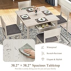 VECELO 5-Piece Square Dining Table Set for 4, 38.2'' Solid Wood Kitchen Table with 4 Upholstered Chairs & 2 Drawers for Dining Room, Kitchen, Small Space, Washed Gray
