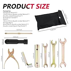 - PORTABLE MULTI-FUNCTION MOTORCYCLE TOOL KIT, YOUR RIDING ESSENTIALS Product AttributesColors: Copper ColorSizes: Double-ended Screwdriver Length: 4.27 inchM6 Hexagonal Wrench: 3.35*1.17 inchScrewdriver Handle: 3.24*0.69*0.69 inch16mm/18mm Double-ended Spark Plug Socket Length: 4.31 inchPliers Length: 5.37 inch12mm/14mm Double-ended Wrench Length: 4.97 inchStorage Bag: 7.28*3.58*0.19 inch 8mm/10mm Double-ended Wrench Length: 4.36 inch 14mm/17mm Double-ended Wrench Length: 5.35 inchWeight: 11.14 ozPackage Size: 7.67*4.68*1.44 inchMaterial: SteelPackaging: Hexagonal Wrench*112mm/14mm Double-ended Wrench*1Double-ended Screwdriver*1Screwdriver Handle*1Pliers*114mm/17mm Double-ended Wrench*1Storage Bag*18mm/10mm Double-ended Wrench*1Double-ended Spark Plug Socket*1 Product Feature & Functions1. With this motorcycle tool kit in hand, timely solution to the unexpected situation in the ride, peace of mind continue to travel, your riding essentials2. All the tools are neatly stored in the storage bag, avoiding the tools to be scattered and lost or bumped and damaged, easy to store and carry, very convenient3. Widely used in motorcycles, bikes, dirt bikes, ATVs, scooters, etc, your riding essentials