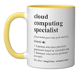 Get laughs in meetings with our design that humorously defines Cloud Computing Specialist as the ultimate multitasker, finding solutions to problems in the most mystifying ways This design is a playful tribute to Cloud Computing Specialist everywhere, with a nod to their daily magic acts of solving the unsolvable. Perfect for any professional with a sense of humor about their daily duties 11-ounce ceramic mug is dishwasher and microwave-safe, lead and BPA free Features glossy finish with accent colors on interior, handle, and rim of two-tone designs