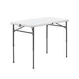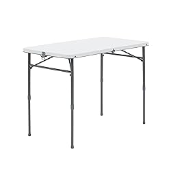 - Provide all of the table spaces that you need in all kinds of settings with the 40" Fold-in-Half Table. This versatile rectangular table is sturdy and durable, made with reliable materials, folds for easy storage and transportation, and adjusts to three different heights. When you're finished using it, just fold in the metal legs, fold the table in half, and your new compact table is ready for transport! Its classic color is sure to fit in at any gathering in any setting, and its spacious expanded 40" long table-top is ideal for holding a wide variety of foods, crafts, or whatever items you are working with! It's great for everyday use both indoor and outdoor, as a serving table, craft supply table, outdoor meal table, or for whatever purposes you may need. The plastic tabletop is easy to clean with no fuss just wipe it down with a damp cloth, and it will look as good as new! The carrying handle makes it perfect for taking on the go, for outdoor barbecues, game nights, school activities, parties, or tailgating events. The tabletop is large enough to be able to sit the whole group down around the table, so all of your friends and family can be included.