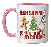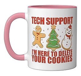 TECH SUPPORT. I'M HERE TO DELETE YOUR COOKIES. Funny Christmas design for your favorite developer who codes all day! Features gingerbread and sugar cookies in the shape of a ginger bread man, Xmas tree, and a snowman cookie. If you're a professional front-end, backend, full-stack, software, or UI/UX developer, you know how easy it is to obsess over codes and programming languages.Click brand name for more funny coding memes for the holidays. 11-ounce ceramic mug is dishwasher and microwave-safe, lead and BPA free Features glossy finish with accent colors on interior, handle, and rim of two-tone designs
