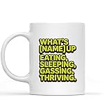- Make every moment special with our What’s up to? Eating, sleeping, gassing, thriving. quote mug. Whether you're shopping for Friend, Brother, Sister, our mugs lets you add custom artwork to create a truly creative gift. Perfect for Easter, or Birthday, Gift-Giving when you want to strengthen bonds. Our charming mugs are ideal for formal settings, wedding favor, or memento. Simply pick your personalization during checkout. Our production team will create your personalized drinkware with high-grade finish and gentle work. Great for contentment, deepening relationships, and sealing memories with mentors. Whether you're looking for multiple finishes, unique, or original that stand out, our comprehensive collection has quality picks for everyone. Order your unique creation today and give a gift that warms hearts for What’s up to? Eating, sleeping, gassing, thriving. celebrations.