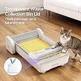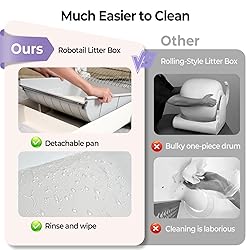 【Design That’s Cat-friendly】Featuring a fully open, roomy toilet area, the Robotail automatic litter box eliminates the anxiety some cats feel in enclosed spaces, and really suits cats weighing 3.3 to 22 pounds. The low 6.7-inch entryway makes it easy for all cats - including kittens, larger breeds, and those with mobility issues - to step in and out with comfort 【Dual Rakes for a Spotless Clean】The dual rakes of Robotail automatic cat litter box work together to make cleaning cleaner and more thorough. The main rake scoops waste into the waste collection bin, while the secondary rake removes clumps stuck to the main rake 【Transparent Visible Waste Cover】 Robotail self cleaning cat litter box has a transparent waste cover. Check waste level at a glance without opening or touching it - saves time, locks odors, and avoids unnecessary waste contact for a cleaner experience 【Zero Risk of Pinching Cats】 Unlike some rolling drum robot litter boxes, Robotail electric litter box has no pinch gap where cats could get pinched. Additionally, it is equipped with 4 highly sensitive gravity sensors that immediately stop operation upon detecting even the slightest weight. Now you can leave home with complete peace of mind, no longer worrying about your cat's safety 【Much Easier to Clean and Maintain】 Unlike the one-piece design of rolling style self-cleaning litter boxes that’s time-consuming and laborious to clean, the Robotail self scooping litter box features a detachable structure. The parts that come into direct contact with waste - the litter pan and rake - are all detachable for quick and easy cleaning. Plus, the bottom of the pan is made of Teflon non-stick material, it can be easily wiped clean with a cloth after rinsing 【APP Control & Multi-Cat Health Tracking】 You can control the cleaning of the smart cat litter box via the APP. There are various cleaning modes to choose from, such as automatic cleaning, scheduled cleaning, and Do Not Disturb mode. The APP also receives real-time cat data, allowing you to monitor your cat's weight in real time. It supports up to 6 cats. Please note that identification errors may occur with cats of similar weight 【Every device we sell comes with a 24-Month warranty. Please feel free to contact us if you have any questions or concerns】