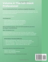 - Master Full-Stack Development, Deployment, and Launch Your Professional CareerZero to Front End Hero: Volume 4 completes your transformation into a full-stack professional. You’ve mastered front-end development—now learn backend fundamentals, deployment strategies, system design, and the career skills that separate good developers from great ones.What Makes This Book Different?Most career books focus on resumes and interviews. This book goes deeper: it teaches you how to think about systems, solve ambiguous problems, and position yourself as a senior-level engineer. You’ll learn not just what to know, but how to keep learning throughout your career.What You’ll Learn:Part I: Security & Deployment • Web security fundamentals (XSS, CSRF, authentication) • OAuth, JWT, and secure session management • HTTPS, encryption basics, and environment management • Deployment strategies, CI/CD, monitoring, and error trackingPart II: Full-Stack Development • Backend fundamentals with Node.js and Express • REST APIs and GraphQL • Databases (SQL vs NoSQL) and data modeling • Server-side vs client-side rendering • Cloud platforms (AWS, Vercel, Netlify) • Docker, containerization, and scaling strategiesPart III: Career & Professional Growth • Building a standout portfolio • Resume, LinkedIn, and networking strategies • Technical, behavioral, and system design interviews • Salary negotiation and remote work best practices • Long-term learning and career growth strategiesPart IV: Algorithms & Interview Prep • Essential data structures and algorithm patterns • Big O explained practically • Problem-solving frameworks and live coding strategiesPart V: AI-Powered Development • Using AI tools (ChatGPT, GitHub Copilot) effectively • Prompting techniques for developers • Where AI helps—and where it doesn’t • Future-proofing your careerPart VI: Capstone Projects Build 3 complete, deployed applications: • A full-stack authenticated application • A containerized microservices project • A production-ready SaaS MVPBonus: 8-Week Interview Preparation Roadmap A structured, step-by-step plan with daily practice and milestones.Who This Book Is For: • Developers who completed Volumes 1–3 (or equivalent experience) • Front-end developers ready to go full-stack • Junior or mid-level developers targeting senior roles • Career switchers and self-taught developersWhat You’ll Be Able to Do: • Build, deploy, and scale full-stack applications • Design systems with confidence • Ace interviews and negotiate strong offers • Think and communicate like a senior engineer • Launch real products and grow your careerPrerequisites: Strong front-end foundation required (HTML, CSS, JavaScript, React or Vue).The Complete Series: This is Volume 4, the final book in the Zero to Front End Hero series: • Volume 1: HTML, CSS, Responsive Design • Volume 2: JavaScript Fundamentals • Volume 3: Modern Frameworks & Practices • Volume 4: Full-Stack Development, Deployment, CareerFrom Developer to Engineer Anyone can learn to code. This book teaches you to design systems, solve unclear problems, and build a sustainable, rewarding career in technology.About the Author: Sepand Asadi is a software engineer and educator who has helped thousands of developers launch and advance their careers.724 pages • Full color • Includes capstone projects, interview roadmap, and career resources