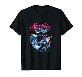 - Algorithm addict in a tiny swirly font, paired with a code scroll chained to a character by a number rope. Hot pink, electric blue, and white linework gives it clean contrast on black and a crisp, modern data science vibe made for coders and stats minds.