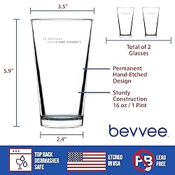 - Give them a glassware update with a coding themed cup scripted with witty syntax, the perfect gift that keeps on refreshing. - Bar Quality Pint Glasses - 16 oz pint glass with heavy weighted bottom suitable for a hoppy ipa, a refreshing pilsner, or delicious craft stout. - Etched text (not printed) - The text is engraved by hand in Colorado and will never wear off - Individually gift boxed glasses designed to ensure safe delivery - Dishwasher safe! Great for daily use. Great beer gift if you're looking for fun gifts for your friends and family. Whether you're wishing a big happy birthday to your favorite beer lover like your best friends, brother, or coworkers, this unique glassware will leave your recipient laughing at the memories created with this gift for years. The design is hand engraved (not printed) into the durable, bar quality pints glass so that it never wears off. These are fantastic presents from that will be cherished for years to come. This isn’t a cheap novelty gag gift. This is quality, dishwasher-safe glassware that is perfect for use as your daily glass... engraved in the USA to boot! All Bevvee glasses are individually boxed and protected for safe delivery. The carefully etched text will never wear off with heavy washing because of the engraving. Each detail is carefully engraved by hand by skilled artisans in our small shop in Northern Colorado. We know you probably have a lot of gift ideas for your favorite beer lover, so thanks for considering our Bevvee Pint Glasses. Cheers!