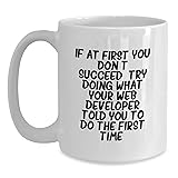 - Are you a web developer or know someone who is? Look no further for a unique and humorous gift! This white coffee mug is the perfect way to poke fun at the common struggles of being a web developer. The quote 'If at first you don't succeed, try doing what your web developer told you to do the first time' is sure to bring a smile to any web developer's face. Whether it's a birthday gift or just a fun addition to their daily routine, this mug is sure to be a hit. Gifts from friends and family show they care, and this mug is a thoughtful way to do so. Gifts for web developers are hard to come by, but this inspirational quote and funny design make it a one-of-a-kind gift. So why settle for a boring gift when you can give a gift that will be used and loved every day? Birthday gifts are a special way to show someone you care, and this unique gift is sure to be a hit. Whether it's a birthday, holiday, or just a random act of kindness, this mug is the perfect way to spread some joy and inspiration. So why wait? Give the gift of a good laugh and a great cup of coffee with this funny web developer birthday gift! Get ready to brighten up someone's day with this hilarious and uplifting gift! Purchase this product today and make someone's day a little brighter!