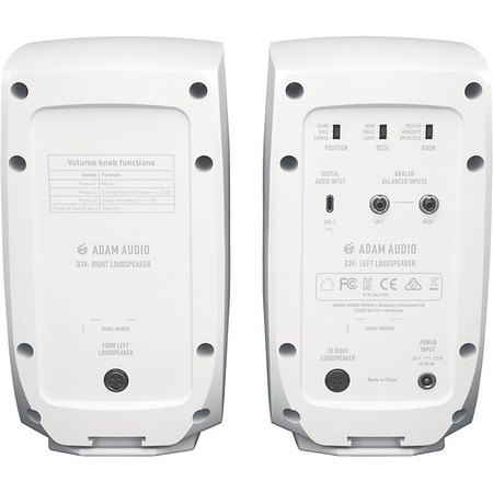 • The ADAM Audio D3V active studio monitors provide high-definition sound for your studio. Built with premium components, the D3Vs feature 3.5" aluminum woofers, dual-sided 3.5" passive radiators and 1.5" ribbon tweeters to deliver full-range audio with stunning clarity and detail. With a USB-C input, the D3Vs connect directly to your computer for high-resolution playback of your DAW projects. Whether you're producing electronic music or recording live instruments, the D3Vs give you the transparent, accurate monitoring needed to shape your mix. Premium Drivers Reveal Nuances in Your Mix The D3V's drivers are carefully engineered to provide the wide, balanced frequency response needed for mixing.