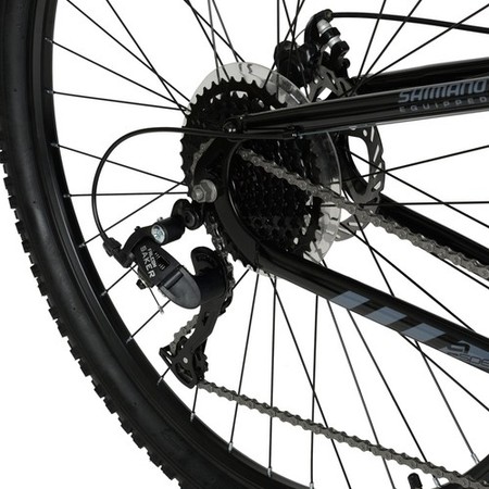 - This Hyper Explorer Dual Suspension Mountain bike is the key to outdoor fun. It features 9 speeds, ensuring versatility in the ride. It also allows riders to change the gears quickly and smoothly. It has alloy rims and front and rear disc brakes.