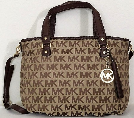 • ~ Monogram jacquard with mocha brown leather exterior. Bag: 16" L x 13"H x 5"W with 9" drop double handles that comfortably fit under arm, and long removable crossbody shoulder strap 20"-24" drop. ~Inside pouch pockets.