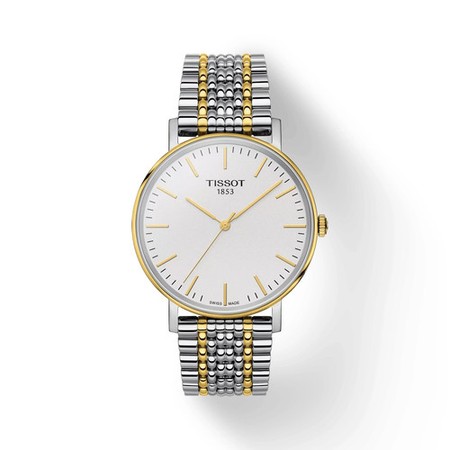 - The Tissot Everytime Gold & Silver 38mm Men's Slim Watch T1094102203100 is a classic timepiece designed for men. Featuring a sleek stainless steel case with a polished silver finish and gold accents, this watch exudes elegance and sophistication. The watch has stick indexes on the silver dial, a water-resistant sapphire crystal, and a reliable quartz movement. With a 30m water resistance, this stylish wristwatch also comes with its original packaging and manual, making it a perfect addition to any watch collection. Made in Switzerland, this Tissot watch combines quality craftsmanship with timeless style.