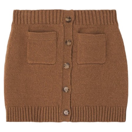 - Burberry Ladies Bottoms. Fashion category: Skirts. SKU: 8055589. Color: Camel Melange. Burberry Knitted Buttoned-Down Skirt.This buttoned mini skirt is crafted from a cotton blend and features an elastic waist, button closure, two front patch pockets, a monogram logo embroidered on the back,a straight hem and a ribbed waist and bottom.Cotton 71%, Polyester 29%.